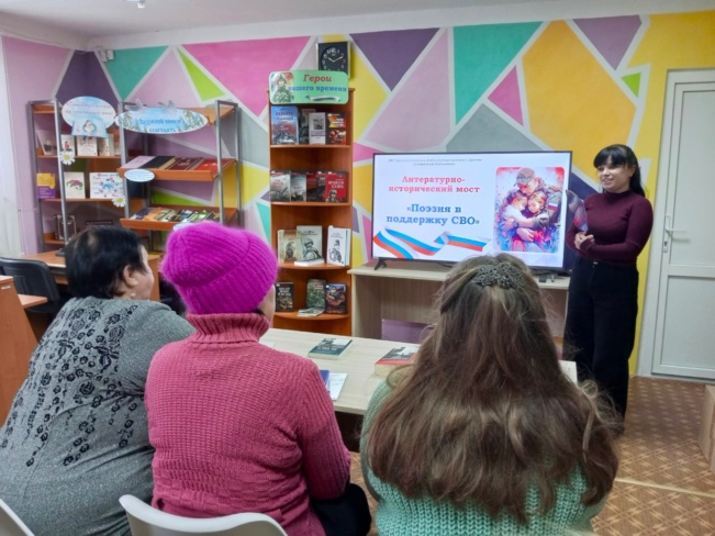 Библиотекари центральной библиотеки подготовили для своих пользователей литературно-исторический мост «Поэзия в поддержку СВО». Мероприятие было приурочено к годовщине специальной военной операции. Присутствующие узнали исторические факты и причины начала специальной военной операции наПодробнее...