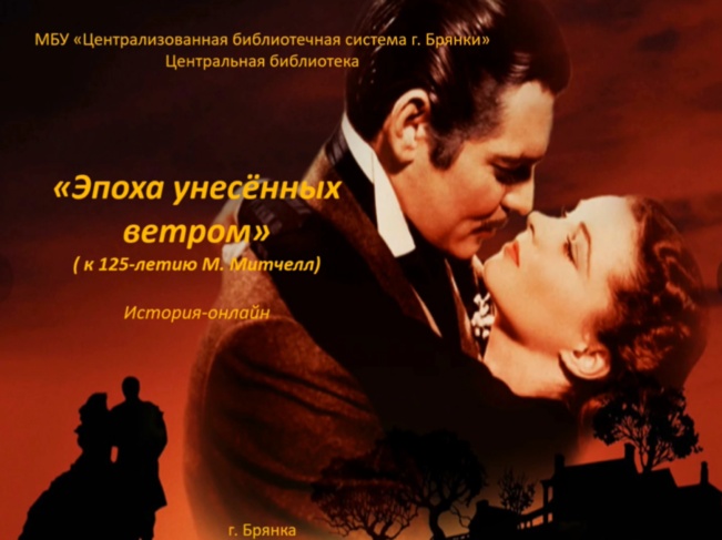 Библиотекари центральной библиотеки подготовили для пользователей историю-онлайн «Эпоха унесённых ветром», приуроченную к 125-летию американской писательницы Маргарет Митчелл. Медиа-презентация познакомит с биографией писательницы и историей создания её знаменитого романа «Унесённые ветром». Роман был удостоен Национальной книжной премией за самый выдающийся роман 1936 года и Пулитцеровской премией за художественную литературу 1937 году.
