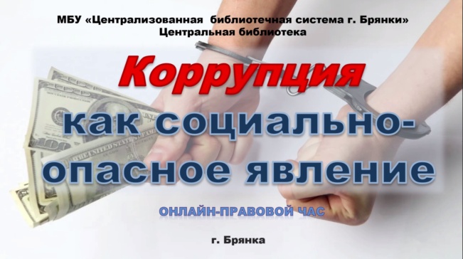 И потому, чтобы привлечь общественное внимание к проблеме коррупции, библиотекари центральной библиотеки подготовили для пользователей онлайн – правовой час «Коррупция как социально-опасное явление». Медиа-презентация ознакомит с понятием «коррупция», формами этого явления, главными причинами возникновения коррупции, а также со способами борьбы с этой серьезной проблемой.