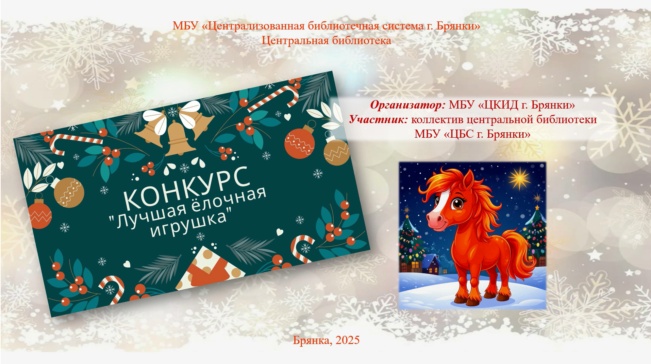 Сотрудники центральной библиотеки приняли участие в конкурсе «Лучшая ёлочная игрушка». Организатор конкурса: МБУ «ЦКИД г. Брянки». Участник: коллектив центральной библиотеки МБУ «ЦБС г. Брянки».